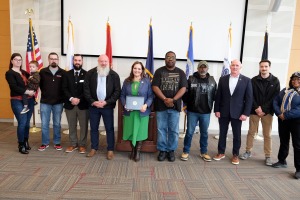 - Campus community gathers to salute veteransFitchburg State University observed Veterans Day with a recognition ceremony on Monday afternoon, dedicated to honoring and celebrating all who have served in the United States Armed Forces, whether in wartime or peacetime. Inside Hammond Hall’s Main Lounge, Fitchburg State faculty, staff, and students gathered to honor the patriotism, courage, and sacrifice demonstrated by veterans across the campus, the local community, and the nation. “Veterans Day is a time for reflection and admiration,” said Fitchburg State’s Director of Military and Veteran Services and Fitchburg State Double Falcon Nolan Buck ‘23, ‘24. “It’s about honoring those who paved the way. It’s about recognizing the leaders who inspire us, and it’s about celebrating the values we carry with us, the ones that make us who we are today.” Buck – a veteran of the United States Marine Corps – is also proud of the fact that the veteran community is growing, vibrant and full of leaders at the university. “Every day I see students stepping up, supporting one another, and making an impact on campus and beyond,” said Buck, who later helped present President Donna Hodge with the prestigious Employer Support of the Guard and Reserve (ESGR) Seven Seals Award. “Fitchburg State is more than a university, it’s a home for veterans.” Buck introduced two female student veterans, Prudence Mecha and Kirsten Perham, who Buck said exemplify the strength and spirit of the Fitchburg State community. Mecha is a United States Air Force veteran who served from 2019-2025 as a weapons troop specialist. She is currently pursuing a degree in economics with a concentration in international business at Fitchburg State. Mecha shared what being a woman veteran means to her. “Women have been serving this country for generations, often quietly, often overlooked, but always with courage,” said Mecha. “It means breaking barriers, and sometimes having to prove that you belong in rooms or even on the fight lines where few women have stood before. It means wearing your service not just as a title, but as a testimony that strength does not have a gender.” Perham served in the U.S. Army as a 68Q, Pharmacy Specialist, and was stationed at Fort Devens. After her medical discharge in 2017, Perham has been pursuing a degree in business administration with a concentration in accounting. “She is also an important member of our VA Work-Study program and is an essential asset not only as a veteran student, but as a female veteran balancing the challenges of school and motherhood,” said Buck. Perham, with her 2-year-old son Emmett in her arms at the podium and her husband Matthew – an Air Force veteran supporting them in the crowd – said that being a female veteran means wearing many identities as a soldier, leader, wife and mother, and learning how each of these roles has shaped who she is today. “I faced challenges that tested my strength, and moments that reminded me just how powerful courage can be,” said Perham. “My time in the military didn’t go exactly how I had planned, but even though my path of service took a different turn, my heart for serving never stopped. I still carry the same sense of duty and pride, not only for my own service, but to honor those who have served or are still serving and those who made the ultimate sacrifice.” Veterans Day stands as a powerful testament to the enduring bond between a grateful nation and the men and women who swore an oath to defend its Constitution and freedoms. It is a time for genuine gratitude, reflection, and ensuring that their commitment is never taken for granted. “Service to our nation doesn’t end with deployment,” said Hodge. “It doesn’t end with retirement, and it certainly doesn’t end at discharge. It continues in how we show up for each other, in how we lead, and in how we live our values out loud. To serve is to care. To carry. To connect. To move forward not because things are perfect, but because the people beside you matter too much to stop trying. That’s what unites us. That’s what builds momentum—not just for this university, but for the country we’re still working to become. “To all our veterans—especially the women whose stories we are just beginning to honor more fully—thank you for your service, for your example, and for reminding us what it means to carry a legacy of loyalty into the future,” said Hodge. Professor Sean Goodlet of the Economics, History and Political Science Department served as the emcee and said that the recognition ceremony carries a special meaning for his family. “Among our relatives, we have numerous veterans and active-duty service members – grandparents, parents, and cousins who served in the Army and Army National Guard, cousins in the Marines, an uncle in the Navy,” said Goodlet. “They served in World War II, Vietnam, and the Gulf War, and now our own son is a submariner in the U.S. Navy. In short, as a family we value service to this country, and we understand the sacrifices – large and small – that soldiers, sailors, marines, and air men and women make almost daily during active service and beyond.” Fitchburg State student and vocalist Autumn Hughes delivered a stirring rendition of the National Anthem. President Hodge received a special surprise during the event, as Buck and ESGR Patrick Donnelly, a volunteer with ESGR and a U.S. Army veteran with 26 years of service, presented her with the Seven Seals Award. “Under Dr. Hodge’s leadership, Fitchburg State has become the model of support for the military community and also a model for other universities to follow,” said Colonel Donnelly, adding that President Hodge was jointly nominated by Buck and Fitchburg State alumna and Air Guardsman Julia Gauvin ‘25. “She has fostered a culture of respect and flexibility for National Guard and Reserve members, ensuring students an